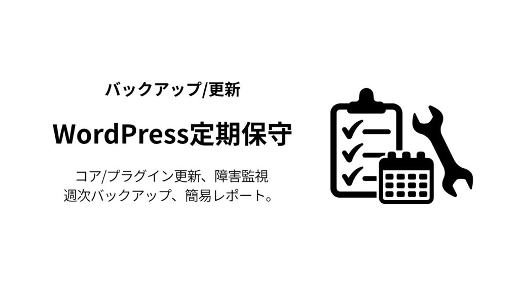WordPress定期保守(バックアップ/更新) ¥ 9,800 / 月 毎月 修正 軽微改修は都度 サービス内容 コア/プラグイン更新、障害監視、週次バックアップ、簡易レポート。 購入にあたってのお願い 大規模改修は別見積。最低契約3か月〜。 サービス仕様 スタイル安定運用 手法WP運用 / 監視 用途保守 業種全業種 他の運営サービス スタンダードプラン(ホームページ制作)一次応答を自動化。有人切替の導線も設計。 プレミアムプラン(ホームページ制作)デザインどおりの高品質コーディング。 ナレッジベース/FAQ構築(検索最適化)自己解決率を高めるFAQを短期構築。 スタータープラン(ホームページ制作)Notionデータをサイト公開・自動同期。